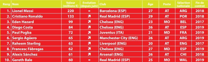 Самым дорогих из гуннеров является Алексис, он оценен в 61 млн. € и является одним из 10 самых дорогих футболистов. Самым представительным клубов в ТОПе является Реал Мадрид (11 игроков).