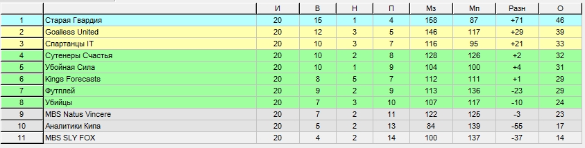 1 место Старая гардия (K@ly@n, Borec, Паровоз, Montlla, R.Federer, Plumber) - 40% призового фонда то есть 920 руб., плюс 100 баллов в реитинг прогнозистов саита кип и 150 млн в фут.менеджер