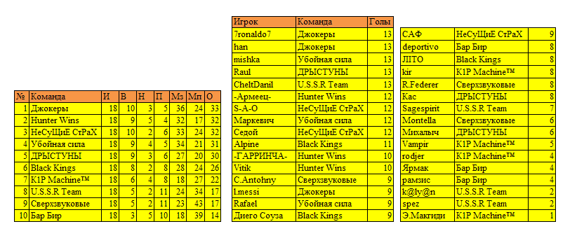 * - Дрыстуны заняли 4 место так как в личных встречах с Gаlаktikos они имеют преимущество: (3:2 и 2:0)