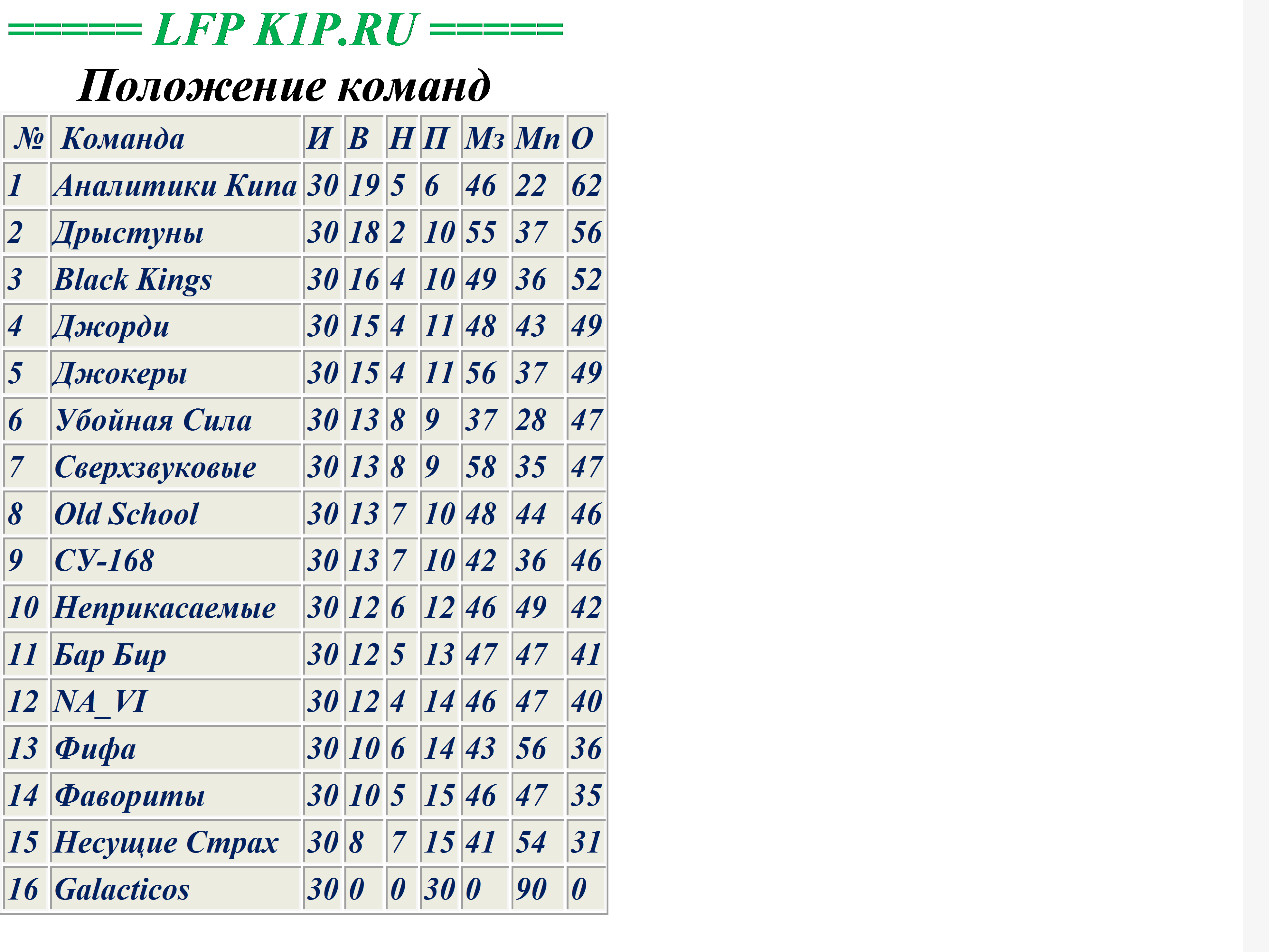 * - по личным встречам команда К1p Mаchine выше в турнирной таблице команды Лубенчане