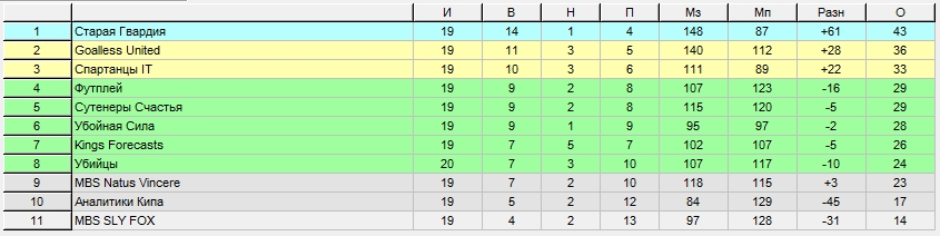 1 место Старая гардия (K@ly@n, Borec, Паровоз, Montlla, R.Federer, Plumber) - 40% призового фонда то есть 920 руб., плюс 100 баллов в реитинг прогнозистов саита кип и 150 млн в фут.менеджер